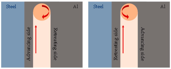 The joint was made using a welding speed of 300 mm/min at 400 rpm and with a force control of 30 kN, changing the feeding direction of the tool along the welding line and maintaining the same rotation direction of the tool (clockwise). In Figure 1, the single-lap FSW joint between the aluminum alloy (AA5083-H111) and the steel sheet (S355-J0) is shown. The direction of the tool’s rotation is identified as follows: (i) AD, when the advancing side is by the side of the steel (lower plate), and (ii) R, when the retreating side is by the steel side (lower plate).