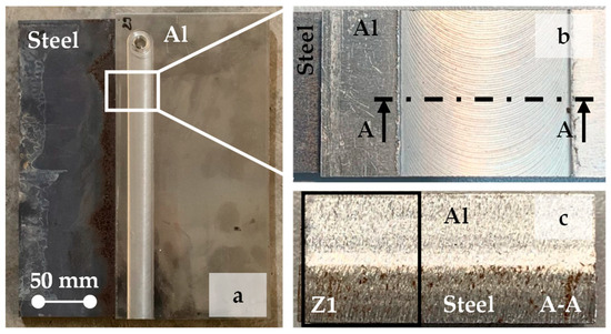 Figure 2 shows the section of the joint where the aluminum and steel subjected to the welding process are highlighted (aluminum/sheet metal interface).