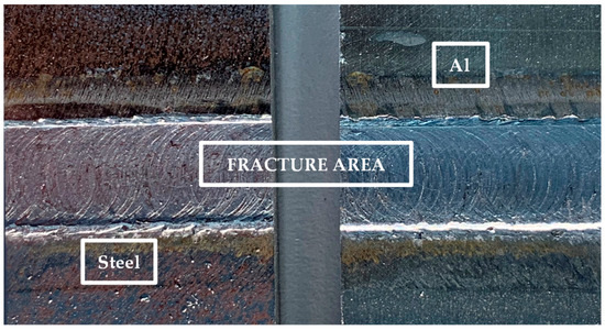 Figure 3 shows the typical failure mode of a joint made for FSW; it is possible to observe the joint area between the steel and the aluminum where the lines produced by the pin during the feed are evident.