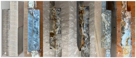 Figure 7, Figure 8, Figure 9, Figure 10, Figure 11 and Figure 12 show the interfaces of the broken samples after the tensile test, produced on both the advancing and retreating sides and subjected to accelerated aging from time T0 to time T5. In the figures, only one sample for each combination of factors has been reported. However, the other four replicas are almost similar except for the samples that were already broken in the climate chamber. The results show, regardless of the welding direction, that the breakage occurs at the junction interface. A preliminary visual analysis shows that by increasing the time spent in the salt spray chamber, corrosion also increases.