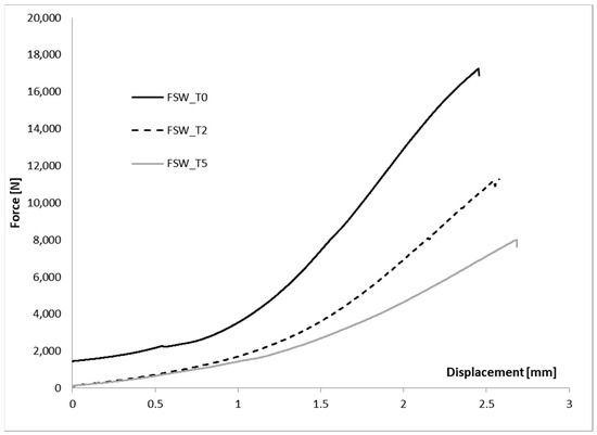 Figure 6 reports load-displacement curves for three intermediate points of the investigated parameters, which constitute the most significant for the research. These are characterized by the same trend, and they are almost overlapping. For all the samples, the curve is characterized by two regions with different slopes. Firstly, the load slightly increases due to small settings in the areas around the weld. Then, the load sharply increases until it reaches the maximum value corresponding to the failure of the joint. The breakage abruptly occurs with the separation of the two welded sheets along the welding surface. As the aging time increases, the maximum load reached by the samples decreases.