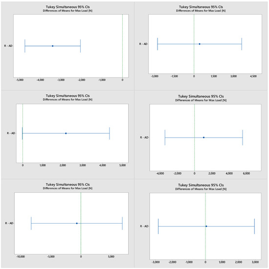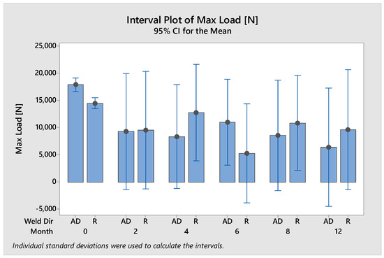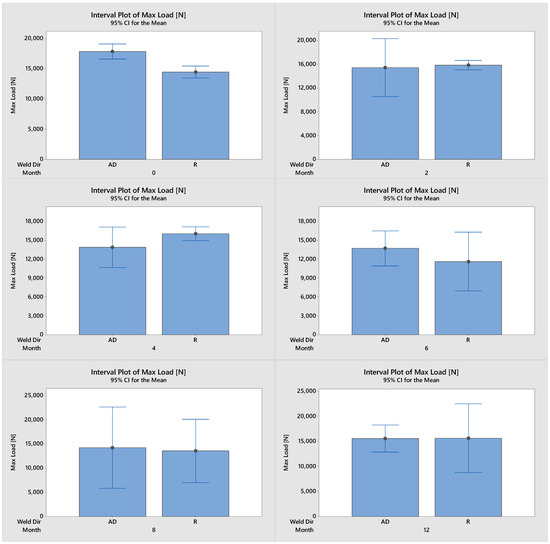 In Figure 16, the Interval Plots of the max load data are reported for each aging time. In these figures, the max load data have lower ranges than in the previous analysis (see Figure 13). This is due to the fact that the broken samples are not taken into account in this case. Instead, the value zero for the broken samples caused the confidence intervals to be larger than the entire length of the histogram bars in Figure 13.