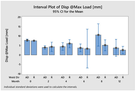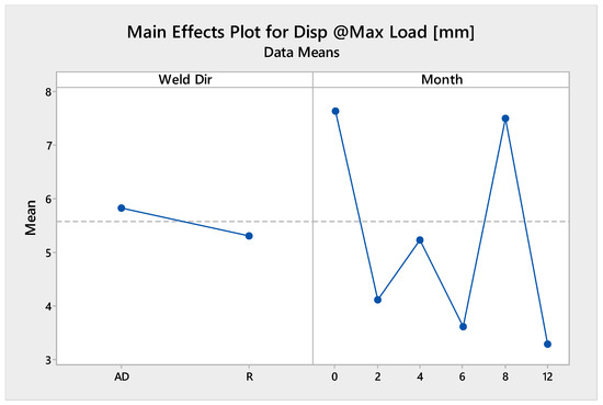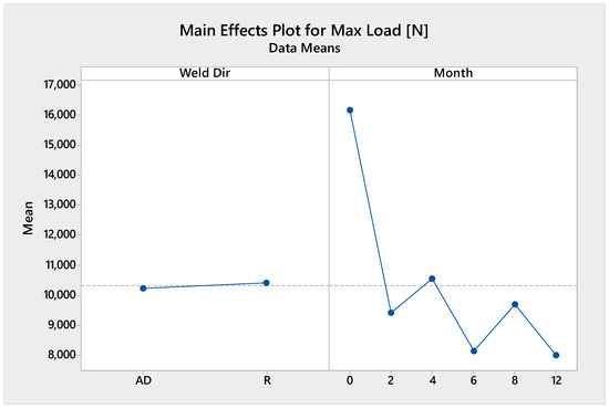 The main effects of the plot for max load are reported in the Figure 15. With this, the general mean values of the load, for all the AD samples and all the R samples, regardless of the aging time (on the left), show how negligible the effect of the welding direction is, with respect to the variation of the mean values attained by increasing the aging time (on the right). As for the effect of aging time (regardless of the welding direction), it is interesting that even though the ANOVA is not significant for this factor, the mean values show a decreasing trend with a mean lower than 10 Kn (the overall mean of the experimental data), starting from the second month. It can be estimated that after the second month, the decrease is higher than 40% (starting from 16 Kn to 10 Kn, we obtained such a value).