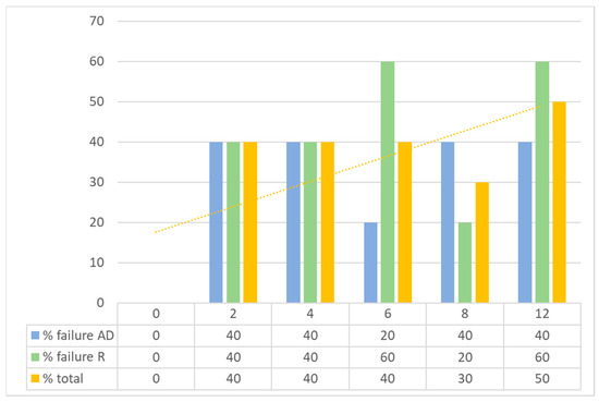 To consider the incidence of the number of broken specimens during aging, this number has been divided by the total number of specimens for each welding direction and for each aging time. The results are shown in Figure 21.