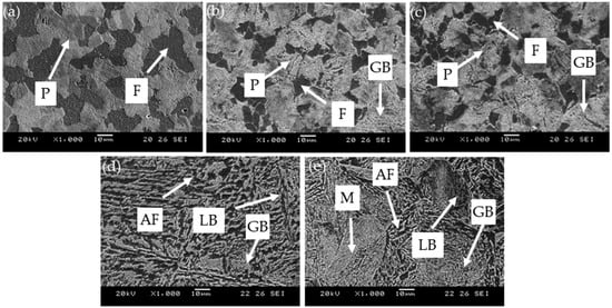 Microstructure evolution of steel under different cooling rates: (a) 0.1 °C/s; (b) 0.5 °C/s; (c) 1 °C/s; (d) 1.5 °C/s; (e) 2 °C/s.