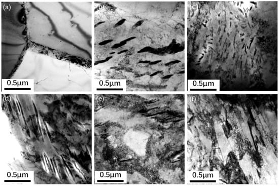 The distribution of dislocations at different cooling rates was characterized and analyzed. The evolution of the dislocation morphology was observed under TEM, as is shown in Figure 4. At various cooling speeds, dislocations occur in the microstructure, which takes the form of bundles of roughly parallel massive ferrite and a nonlayered structure composed of intermingled cementite. However, our comparison shows that the dislocation density in the fine structure of the material is significantly higher for high-speed cooling than for low-speed cooling, as shown in Figure 4. Cooling rates below 1.0 °C/s result in improved dislocation density.