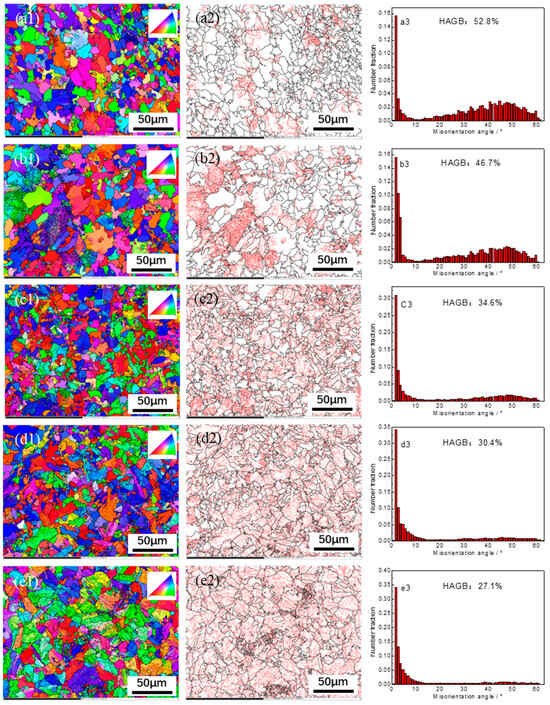 EBSD analysis results for different cooling rates of steel. Grain orientation imaging: (a1–e1); grain boundary distribution map of large and small angles: (a2–e2); grain boundary misorientation distribution map: (a3–e3); 0.1 °C/s (a1–a3); 0.5 °C/s (b1–b3); 1 °C/s (c1–c3); 1.5 °C/s (d1–d3); 2 °C/s (e1–e3).
