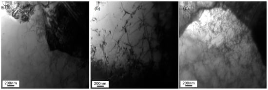 Dislocations in steel under different cooling rates: (a) 0.1 °C/s; (b) 1 °C/s; (c) 2 °C/s.