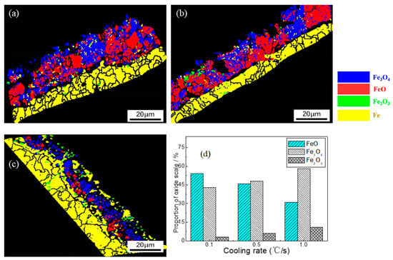 The EBSD analysis results for the distribution of scale phase on the surface of the experimental steel for different cooling rates are shown in Figure 5. The test results show that with the acceleration in the cooling rate, the thickness of the oxide sheet on the surface of the material gradually decreases, which is consistent with our observation using the microscope. The phase structure is mainly the FeO phase, the Fe3O4 phase, and a small amount of the Fe2O3 phase, and the interphase gap is large. With an acceleration in cooling, the proportion of the FeO phase gradually decreases, and the proportion of Fe3O4 and Fe2O3 phases increases gradually. It can be seen from the test data that in the cooling speed range of 0.1–0.5 °C/s, the oxide phase is dominated by the FeO phase and the Fe3O4 phase, which account for 54% and 43%, respectively. The phase structure of the oxide layer has no obvious stratification and is in a cross-mixed distribution state. When the cooling rate rises to 1.0 °C/s, the proportion of the FeO phase and the Fe3O4 phase becomes 31% and 58%, respectively. At this cooling rate, the FeO phase and Fe3O4 phase are evenly distributed inside and outside, and the Fe2O3 phase is scattered throughout the FeO phase and Fe3O4 phase. When the cooling rate is 2.0 °C/s, no oxide sheet is found under EBSD. The experiment shows that when the cooling rate is controlled in the range of 0.1–1.0 °C/s, the transformation of the oxide sheet is mainly the FeO phase, the Fe3O4 phase, and a small amount of the Fe2O3 phase. The acceleration in the cooling rate is conducive to an increase in the proportion of the Fe3O4 phase, and the corrosion protection of the surface oxide layer is maintained as the oxide sheet thins.