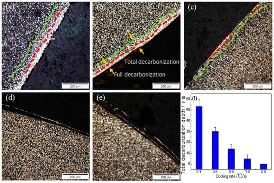 Decarburization layer morphology of steel for different cooling rates: (a) 0.1 °C/s; (b) 0.5 °C/s; (c) 1.0 °C/s; (d) 1.5 °C/s; (e) 2.0 °C/s; (f) curve of decarburization depth.