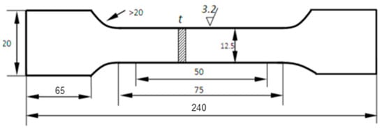 A Zwick-010 high-temperature tensile machine (ZwickRoell, Ulm, Germany) equipped with a laser extensometer and resistance heating furnace was used for the test, and a manual fine-toothed jig was installed in the sealed furnace. The temperature limit of the test environment was 600 °C, and the maximum load of the tensile sensor was 500 N, with a loading accuracy of 1% of the actual load. Waste aluminum foil was used to wrap around the gripping end of the tensile sample (3–5 layers) to prevent the clamping die from damaging the clamping end of the specimen to be stretched. The high-temperature tensile tests were carried out in accordance with ISO 6892-2 [21]. Loading began after the heating temperature reached the set temperature and was held for 5 min. The preload used in the high-temperature tensile test was 5 MPa. During the tensile test, the stretching speed from the elastic stage to the upper yield point stage was 0.75 mm/min, and the stretching speed from the upper yield point to fracture was 1.125 mm/min. The precision of stretching temperature was ±3 °C from room temperature to 500 °C. Three samples were tested at each temperature, and we took the average of the test values. The sample size of the high-temperature tensile test is shown in Figure 1.