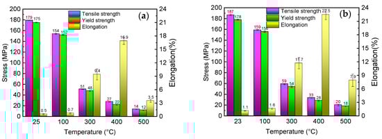 The tensile mechanical properties of 3003 and 3003mod aluminum alloys at different temperatures are shown in Figure 3. As can be observed from the figure, with the increase in temperature, both the tensile strength and yield strength of 3003 and 3003mod aluminum alloy displayed decreasing trends, and the amount of this decrease was similar. The tensile strength and yield strength of 3003mod alloy at room temperature were 187 MPa and 178 MPa, respectively, which are 4.5% and 1.7% higher than those of 3003 alloy. The tensile strength and yield strength of 3003mod alloy at 100 °C were 3.2% and 2.6% higher than those of the 3003 alloy, respectively. Similarly, the tensile strength and yield strength of 3003mod alloy were 15.7% and 12.6% higher than those of the 3003 alloy at 300 °C, respectively, while they were 22.2% and 27.3% higher than those of 3003 alloy at 400 °C, and 42.9% and 50% higher at 500 °C, respectively. The rates of reduction rate in the tensile strength and yield strength of the 3003mod alloy were 62.9%, 44.1%, 39.4% and 65.4%, 48.1% and 35.7%, respectively, while rates of the reduction in the 3003 alloy were 66.9%, 47.1%, 48.1% and 68.4%, 54.2% and 45.5%, respectively. The above results indicate that the 3003mod alloy had a higher high-temperature strength at the same test temperature, and the strength of 3003mod alloy was less affected by temperature than that of the 3003 alloy. In terms of elongation, the 3003 and 3003mod aluminum alloys first elongated with the increase in test temperature, and then decreased sharply after reaching a peak at 400 °C. The elongation of the 3003mod alloy was greater than that of the 3003 alloy at each temperature.