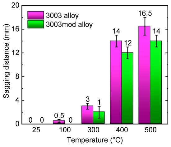 Figure 4 shows the sagging distances of 3003 and 3003mod aluminum alloys after being held at various temperatures for 5 min. As can be seen from the figure, when the temperature increased from room temperature to 100 °C, there was no obvious sagging in the 3003 and 3003mod alloys. When it continued to rise to 300 °C, both alloys showed slight sagging, but the sagging value was very small. As the temperature increased to 400 °C, the 3003 and 3003mod aluminum alloys exhibited sharp sagging, with average sagging distances of about 14 mm and 12 mm. After holding at 500 °C for 5 min, the average sagging distances of the 3003 and 3003mod aluminum alloys increased to 16.5 mm and 14 mm, respectively. The sagging test results indicate that 3003mod alloy had better sagging resistance properties than 3003 alloy.