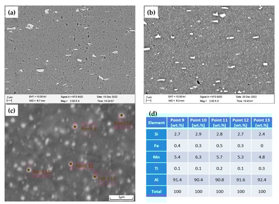 Figure 5 shows the cast microstructure and EDS analysis results of the 3003 and 3003mod aluminum alloys. As shown in the figure, there are a large number of grain boundaries distributed in a network and composed of eutectic structures in the 3003 aluminum alloy. The eutectic structure inside the 3003mod ingot is significantly reduced, and most grain boundaries are discontinuously distributed in a tridentate shape. The scanning electron microscope backscatter electron image clearly displays a dark matrix and bright white coarse particles, among which the size and shape of the coarse particles in the 3003 aluminum alloy are similar to those in the 3003mod aluminum alloy, but the density is much higher than that in the 3003mod aluminum alloy. The bright white coarse particles in the EDS results for the 3003 aluminum alloy show that the coarse particles mainly contain four elements: Al, Fe, Mn, and Si. In addition to the matrix, the element with the highest mass fraction is Fe, followed by Mn. The coarse particles in the 3003mod aluminum alloy are also in the Al–Fe–Mn–Si phase, but the element with the highest content besides Al is Mn. It is worth noting that the Al content in the coarse phase of 3003 and 3003mod aluminum alloys is within the range of 73–75 wt.%. This result indicates that the adjustment of Si, Fe, and Zr elements causes a change in the proportions of Fe and Mn in the coarse particles, but hardly changes the Al content. On the other hand, it significantly reduces the number of coarse particles in the as-cast alloy.