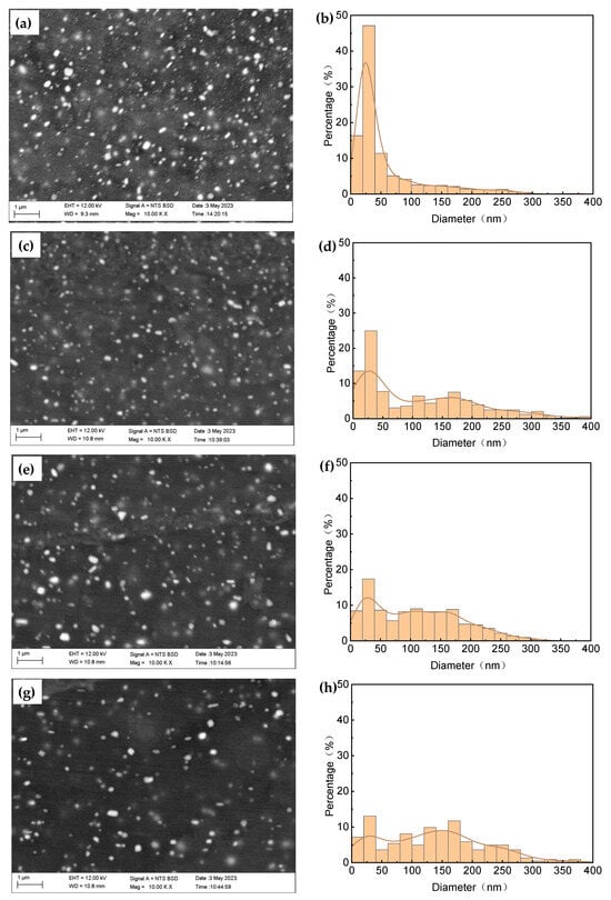 SEM images and nanoparticles’ size distribution of 3003mod aluminum alloy at different temperatures: (a,b) Room temperature; (c,d) 300 °C; (e,f) 400 °C; (g,h) 500 °C.