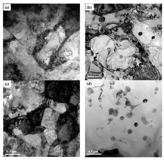 Figure 9 displays TEM images of the 3003mod aluminum alloy held for 5 min at different temperatures. High-density dislocation entanglement can be observed in the recrystallization-annealed and 40% cold-rolled 3003mod aluminum alloy. A recovery phenomenon occurred inside the alloy, and the internal microstructure contained a large number of dislocation cells after being held at 300 °C and 400 °C. During holding at 300 °C, a certain density of dislocations inside the cell could still be seen, while after being insulated at 400 °C, the dislocation cell structure grew, and the dislocation density inside the cell decreased significantly, with a small amount of fine recrystallized grains appearing. Further increases in the insulation temperature to 500 °C, with no dislocation cells in the entire field of view, and coarse nanoparticles with a size greater than 100 μm could be observed. This result shows that the grains of the 3003mod aluminum alloy finished recrystallization, and grew and coarsened at this temperature.