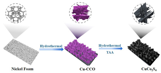 The NFs were purchased from Tianjin Damao Chemical Reagent Co., Ltd. (Tianjin, China) Cobalt nitrate hexahydrate (Co(No3)2·6H2O), Thioacetamide (TAA), Urea (CH4N2O), Copper nitrate trihydrate (Cu(No3)2·3H2O), and Potassium Hydroxide (KOH) were purchased from the official website of Aladdin Reagent (Shanghai, China), and all of the chemicals were analytically pure and not further purified. The deionized water used came from local sources.