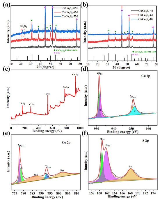 (a) XRD diagram of CuCo2S4-5M, CuCo2S4-6M, and CuCo2S4-7M; (b) XRD patterns of CuCo2S4-4h, CuCo2S4-6h, and CuCo2S4-8h; (c) XPS full spectrum of CuCo2S4-6h, (d) Cu 2p, (e) Co 2p, and (f) S 2p.