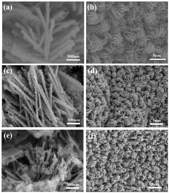 In order to investigate the optimal time for vulcanization, this study also explores the effect of hydrothermal time on the morphology of the material after vulcanization. It is worth noting that even after further sulfuration treatment, the Cu-CCO precursor was successfully converted to CuCo2S4, while maintaining its flower-like hierarchical nanostructures (Figure 4a,b). As shown in the SEM images captured after a hydrothermal time of 6 h in Figure 4c,d, the flower-like hierarchical CuCo2S4 nanostructure arrays grown on the NFs are more upright and ordered; the electrodes have more contact with the electrolyte, thus providing more active reaction sites. On the other hand, as shown in Figure 4e,f, the vertically grown flower-like hierarchical nanostructures on NFs appear less ordered and structurally intact compared with CuCo2S4-6h.