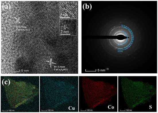 To further observe the microstructure and crystallinity of CuCo2S4, it was analyzed using TEM. Figure 5a shows a high-magnification scanning transmission electron micrograph of CuCo2S4, and the facet spacing of 0.33 nm and 0.28 nm obtained from the TEM maps corresponds to the (133) and (022) facets of the CuCo2S4 spinel phase [45]. Figure 5b displays the selected electron diffraction map of CuCo2S4, where diffraction rings correspond to the (022), (224), and (004) crystal planes of CuCo2S4. These findings align with the results obtained from the XRD. The elemental mapping of CuCo2S4-6M (Figure 5c) shows that Cu, Co, and S elements are uniformly distributed in the sample.