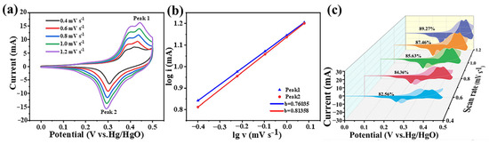 where IP is the peaks current, a and b are the constants, k1v represents the surface contribution, represents the diffusion contribution, and b is the slope of the straight line in Figure 7b, which is closely related to different electrochemical behaviors. When b = 1, surface control presents capacitive behavior, whereas when b = 0.5, diffusion control presents battery behavior. For the CuCo2S4 electrode, b values of 0.78 and 0.81 can be obtained from the calculations, indicating that the surface capacitance and diffusion control exist simultaneously, with the b value being close to 1. Thus, its contribution was fitted and analyzed by Equations (7) and (8). From Figure 7c, it can be observed that the surface control accounts for 82.56%, 84.36%, 85.63%, 87.46%, and 89.27% of the total capacitance as the rate increases. Additionally, the surface-controlled capacitance contribution increases with the scan rate, indicating that the electrode is dominated by capacitive behavior during the electrochemical reactions.