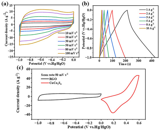 To further evaluate the practicality of the ASC device, we assembled a two-electrode supercapacitor with CuCo2S4 as the positive electrode and RGO as the negative electrode in 2 mol L−1 KOH electrolyte. Figure 8a shows the CV curves of the RGO at 10–100 mV s−1, where the quasi-rectangular shape of the bilayer capacitance behavior can be clearly seen. The GCD curves of RGO at 1–10 A g−1 (Figure 8b) show a clear, distinct symmetric triangle, indicating high reversibility. Meanwhile, the CV curves for the two electrodes RGO (−1–0 V) and CuCo2S4 (0–0.6 V) were tested in a three-electrode system at 50 mV s−1 (Figure 8c).