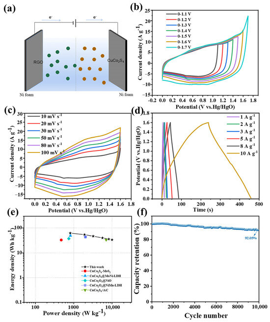 Figure 9a shows the schematic diagram of ASC assembled by CuCo2S4//RGO. In order to determine the most suitable operating voltage range, we performed CV tests at 50 mV s−1 (Figure 9b). It is seen that there is no significant change in the curve until the voltage window reaches 0–1.7 V, where a significant polarization occurs. This indicates that the ASC has a stable voltage window at 1.6 V [50]. The CV curve of ASC is shown in Figure 9c. As the sweep speed increases, the area around the CV curve expands, showing good capacitive behavior and multiplier performance. The specific capacitances of CuCo2S4//RGO were 228.1, 198.3, 183.6, 163.6, 146.2, and 141.5 F g−1 at 1–10 A g−1 (Figure 9d). Figure 9e shows the Ragone diagram of CuCo2S4//RGO, which demonstrates that the CuCo2S4//RGO device has a high power density (812.1 W kg−1) and energy density (61.8 Wh kg−1), which outperforms many copper–cobalt-based supercapacitors (Table S1) [35,51,52,53,54]. This indicates that the energy density of the ASC device is well maintained. The CuCo2S4//RGO device exhibits excellent stability, maintaining a specific capacitance of 82.8% after 10,000 cycle measurements at a high current density of 10 A g−1 (Figure 9f).