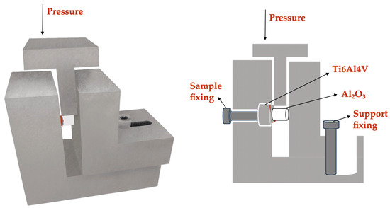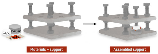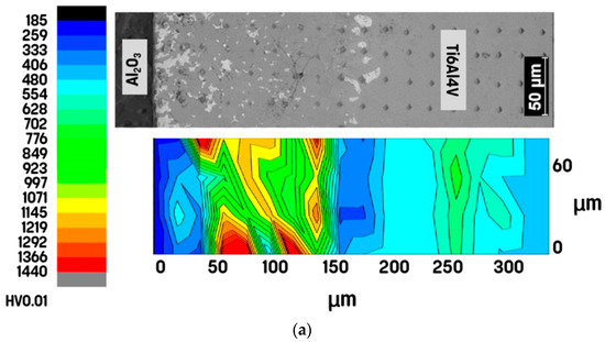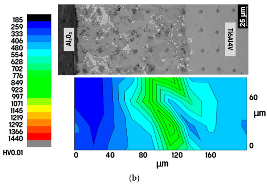 Solid-state diffusion bonding is one of the most common joining processes reported in the literature when creating joints between titanium alloys and advanced ceramic materials. However, in these studies it is observed that achieving joint integrity is only possible with high pressures at elevated temperatures [9,10,11,12,13,14,15,16,17,18,19,20,21,22,23]. The drawbacks of this process are primarily associated with economic concerns, due not only to the required equipment but also the processing of the joints and preparation of the base materials. Additionally, stringent processing conditions can lead to significant changes in Ti6Al4V alloys, especially if the temperature exceeds the β-transus transformation, compromising the mechanical properties of this base material. Nevertheless, this process has the advantage of applying components with highly complex geometries to materials with dissimilar properties. It allows for the application of an interlayer that may enhance the process, improving properties or even reducing the processing conditions.