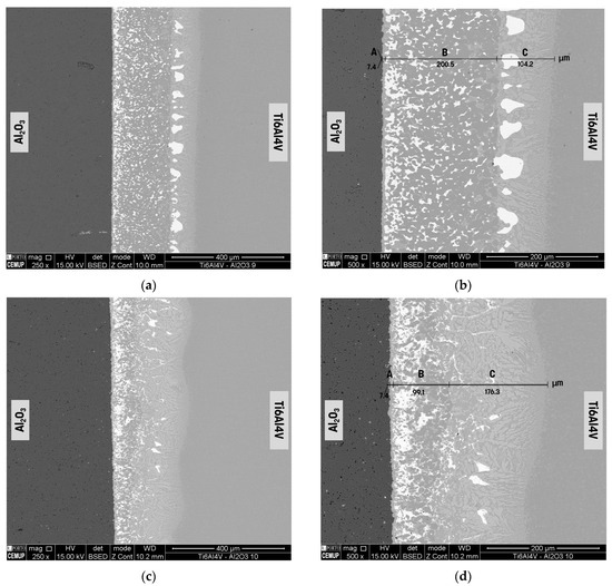 The joint interfaces show notable differences but can be divided into three reaction layers (A, B, and C). The thickness of the combined titanium films in the brazing filler (Ti-Ag/Cu-Ti) affected the reaction’s thickness at the interface’s microstructure. The interface processed using thicker titanium films (0.075 mm) in the brazing filler exhibited a thinner Layer A close to the Al2O3 base material. Layer B was composed of a gray matrix with brighter dispersed particles. These bright particles had a non-uniform distribution and were larger near the ceramic. Near Ti6Al4V, a dual-phase matrix was observed with larger bright particles at the interface with Layer B. When the thickness of the titanium films used in the filler decreased to 0.015 mm, the interface exhibited a Layer A close to the Al2O3, similar to the one observed for the interface produced with thicker titanium film (0.075 mm)—the main differences were observed at the interface and concerned the thickness and microstructure of Layers B and C. The thickness of Layer B decreased, and although it exhibited a mixture of gray and bright phases, the distribution of the particles was more uniform. Layer C exhibited a similar microstructure but was characterized by a higher but irregular thickness, and the bright particles observed were fewer and smaller.