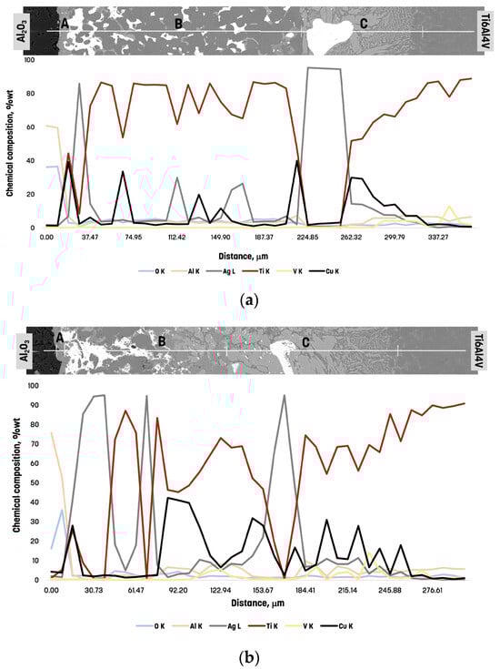 The elemental distribution was performed via EDS line profiles across the interfaces. The EDS profiles for both interfaces are presented in Figure 4, which shows the effect of reducing the Ti thickness in the brazing filler. Layer A was made up of Ti, Cu, and Al. Some oxygen was also detected in this layer, which may have originated from the Al2O3 base material and formed a very thin layer of complex oxides. In the B layers, the Ti element had the highest percentage, with peaks of Ag and Cu observed in the brighter particles that made up this layer. A more uniform composition was observed for the interface produced with the thicker titanium sheet in the filler. In contrast, the interface produced with the thinner Ti films showed higher concentrations of Ag and Cu in this layer. The C layers were mainly titanium, with Ag-rich bright particles and a Cu-rich light gray phase.