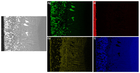 The elemental distribution across the interface produced with the Ag/Cu brazing filler combined with Ti at 0.015 mm was also evaluated via EDS maps, as shown in Figure 5. Titanium was present throughout the interface. However, a layer richer in Ti was also observed near Al2O3. Cu was detected more predominantly in areas adjacent to Ti6Al4V. Regarding Ag, it was possible to detect that the brightest particles observed in the SEM images corresponded to particles rich in this element. Although the Al map exhibited challenges in readability, the element was observed to be distributed across the interface, with the notable exception of regions rich in Ag.