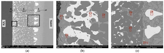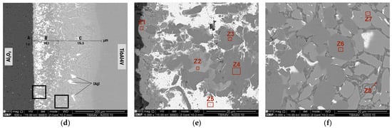 SEM images of the interface processed with (a–c) Ti (0.075 mm)-Ag/Cu-Ti (0.075 mm) and (d–f) Ti (0.015 mm)-Ag/Cu-Ti (0.015 mm) brazing filler. The zones identified (Z1 to Z8) in (b,c,e,f) are the regions where the EDS analysis was performed. The reaction layers are marked as A, B, and C at the interfaces.