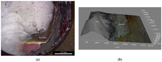 The effect of adding Cu foil to a commercial silver-based alloy in the joining of Ti6Al4V to Al2O3 was studied by Cao et al. [21]. The brazing experiments were processed at 825 °C for 10 min using a combination of Ag/Cu and Cu foils with different thicknesses (10, 40, and 120 µm). The results indicated that adding the Cu foil to the brazing filler significantly improved the shear strength, which increased from 118.4 ± 5.4 MPa with the Ag/Cu alloy alone to 157.4 MPa with the Ag/Cu alloy and the thicker Cu foil. This strength increase was attributed to the diffusion of Cu, which enabled a reaction with the Ti in the titanium alloy that led to an intermetallic that improved the joint’s mechanical properties. However, to avoid negative effects the formation of these intermetallics should not exceed 3% [15]. The use of titanium-based alloys results in higher mechanical strength. Alves et al. [16] investigated using a commercial TiCuNi brazing filler in Al2O3/Ti6Al4V brazing. Their results demonstrated that an interface processed at 980 °C consisted of α-Ti, TixOy, and Ti2(Cu,Ni) with a 168 ± 13 MPa shear strength. The shear fracture is observed through the interface and partially through the interface between the Al2O3 and the layer with higher hardness. However, titanium-based fillers enable very high properties by increasing the processing temperature [22].