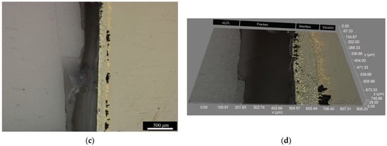 The evaluation of joint integrity involved conducting hardness and shear strength tests. The hardness tests were performed via Vickers microhardness tests (HV0.01) using a FALCON instrument (INNOVATEST Europe BV, Maastricht, The Netherlands). The applied force for all measurements was 0.09807 N (0.01 kgf). Matrices of indentation, consisting of four columns, were made along the interface, starting at the interface’s proximity to the Al2O3 base material, with a distance of approximately 200 µm between each indentation.