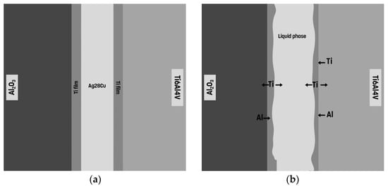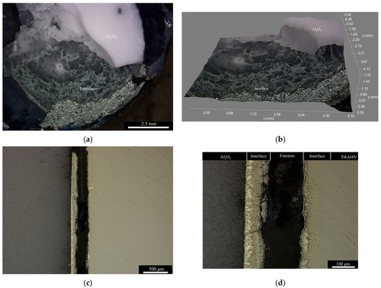The development and processing of titanium alloys has been intensively researched because of their attractive properties, such as high specific strength, thermal stability, excellent corrosion resistance, and low density. Aerospace, chemical, and automotive applications have the most advantages in using these alloys based on their favorable properties. However, an important aspect of these applications is service temperature, which for these alloys is approximately 500 °C [1,2,3,4]. To produce more complex components, especially for the aerospace industry, titanium alloys can be combined with advanced ceramics to extend their applications by producing components with unique properties. This requires the production of reliable joints. Research into joining processes between Ti6Al4V alloys and advanced ceramics such as alumina (Al2O3) and zirconia (ZrO2) has increased significantly in recent years. The effective bonding of these materials will enable the production of diverse components for application in the aerospace, automotive, electronics and nuclear industries, such as missiles, semiconductors, vacuum ducts, energy converters, and satellites [5,6,7,8].