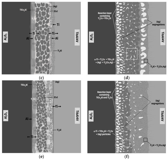 In the reaction between the brazing filler and the Ti6Al4V base material (Layer C), the interdiffusion of Ti and the diffusion of Al contribute to forming a thicker reaction layer with less segregation of the solid solution of Ag and Cu (Figure 10c,d). An increase in Ti thickness in the brazing filler may considerably impede the dissolution of Ti from Ti6Al4V. This diffusion of Ti into both base materials impacts the joining process significantly. The thinner the film, the easier the diffusion, due to both the shorter distance and its structure, which are favorable factors in forming interface reaction layers (Figure 10e,f).