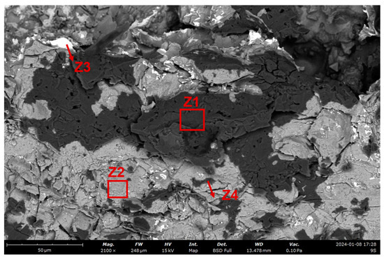 SEM image of the surface of the shear-tested sample of the joint produced with Ti (0.075 mm)-Ag/Cu-Ti (0.075 mm) brazing filler. The zones identified (Z1 to Z4) are the regions where the EDS analysis was performed.