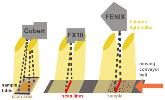 The setups presented in Figure 2 were used to acquire the HSI data from the push broom scanners Specim Fenix and Specim FX10 as well as the snapshot camera Cubert Ultris X20. The Specim FX10 and Specim Fenix sensors detect a line of pixels and are therefore mounted above a conveyor belt moving the samples to add a second dimension, whereas the Cubert Ultris X20 detects a square area of the sample plane. The sample planes of both setups are illuminated uniformly by halogen light bulbs.