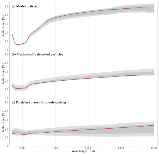 Reflectance spectra of Al from the Spectral Evolution PSR-3500 differ in different stages of the recycling process: model Al particles (a), decoated Al particles (b), and Al particles with cathode coating (c). Variations depending on the exact spot on the sample material are represented by quantiles in shades of gray: the second to the nineteenth 20-quantile in light gray and the second as well as the third 4-quantile in dark gray. The most representative measurement depicted by the red curve was determined by minimizing the mean euclidean distance to all other spectra.