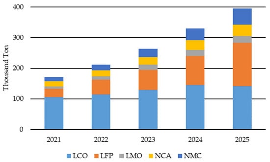 The demand for LIBs has grown steadily since their commercialization in the early 1990s. In the first phase, this was mainly driven by consumer electronics, such as digital cameras, mobile phones and laptops [8]. Subsequently, the electrification of motor vehicles, such as hybrid EVs and plug-in hybrid EVs, contributed to a further increase in demand [9]. In Germany alone, it is estimated that fifteen million private and commercial EVs (pEVs and cEVs) will be needed by 2030 to meet climate targets [10]. In addition to the large, expected increase in demand in the EV segment of between 25 and 50 percent per year, demand increases of up to 15 to 20 percent can also be expected from the sales of cordless household appliances, such as vacuum cleaners [11,12,13]. LIB represents half of the current battery production market [14]. Pb batteries have always been a close second in terms of annual revenue but still dominate the market with production capacity in MWh [15]. By 2030, however, the LIB will be responsible for double the market share of Pb batteries [14]. Other battery types, such as ZnMn, NiMH and NiCd batteries, only make up around 10%. A performance review of one of the German collection schemes shows that approximately 88% of all marketed power tool batteries in 2022 were LIBs, with the others mainly being AlMn, Zn and NiMH batteries [7]. Of the collected spent rechargeable batteries in 2022, 54% were LIBs, 29% NiCd batteries and 17% NiMH batteries. With the current market share of sold LIBs and the EU ban on NiCd batteries, it is expected that the market share of collected spent LIBs will extend significantly over the next few years. While during the introduction of LIBs, only lithium cobalt oxide (LCO) was used, various alternatives have been developed over the last 30 years. In particular, the two cathode active materials, lithium iron phosphate (LFP) and lithium nickel manganese cobalt oxide (NMC), have established themselves with a cumulative market share of about 60 to 65% [15]. In EV applications, lithium nickel cobalt aluminum oxide (NCA) is also used as a cathode active material [16]. Figure 1 shows the global amount of LIBs available for recycling for the years 2021 to 2025. It shows that LCO up until 2025 is still the leading CAM in EoL-LIBs, with LFP, NMC and NCA increasing their share. This can be explained by the increasing number of xEV.