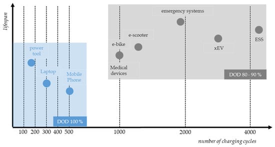 Lifetime of LIBs in different applications, with and without limitations of the depth of discharge (DOD). Adapted from Ref. [21].