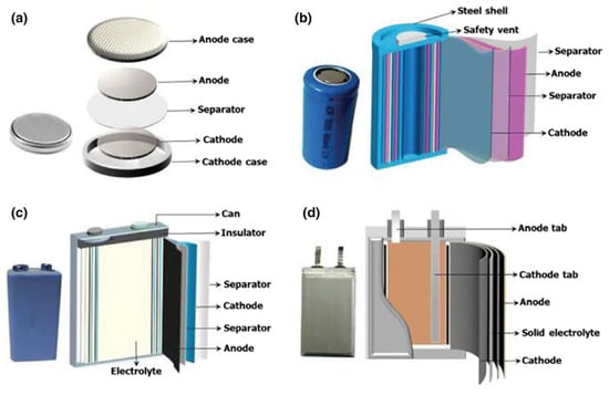 Different LIB cell formats: (a) button cell, (b) cylindrical cell, (c) prismatic cell, and (d) pouch cell. Adapted from Refs. [60,61].
