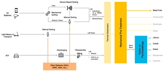 In Germany, spent batteries as well as waste electrical appliances must be taken back by every retailer according to § 9 BattG and § 17(1) 2. ElektroG2 [67,68]. For the individual cells and battery packs, there are disposal boxes in which the consumer can separate the used batteries into LIBs and others. Since a mixed waste battery fraction with different chemical compositions cannot be recycled [62,69] and a sorted return by the consumer cannot be guaranteed, sorting based on the chemical composition of the waste batteries is necessary.