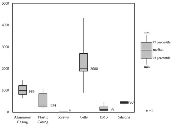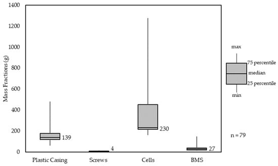 For a representative study of the assembly of PT-LIBs, 79 PT-LIBs were dismantled and balanced on three different days (19 June 2023, 27 June 2023, 13 July 2023, 29 November 2023) at the Löhne (NRW) and Kuppenheim (Baden-Württemberg) sites of Relux Umwelt GmbH and Circu Li-Ion GmbH. Figure 6 shows an exemplary, dismantled PT battery pack with different materials used. The PT-LIB has been manually dismantled and sorted into four categories: