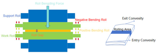 The bending rolls exhibit significant magnitudes and substantial fluctuations during the rolling procedure. The present study investigates the coupling relationship between the bending roll force and the rolling gap while maintaining a constant rolling convexity [24]. The simplified structure of the mill and workpiece is shown in Figure 1.