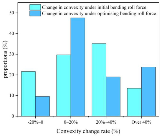 The alteration in convexity’s rate of change when optimizing the bending roll force is shown in Figure 3. Following the optimization of the bending roll force, there is an observed increase in the percentage of the hot-rolled final product exhibiting a rate of change of convexity within the ±20% interval. Specifically, this percentage rises from 51.3% to 57.1%. The range of the highest probability deviation interval has been modified, shifting from 20% to 40% to a new range of 0% to 20%. It is evident that by decreasing the magnitude of the bending roll force variation, one can mitigate the rate of convexity alteration and enhance the stability of the rolling process.