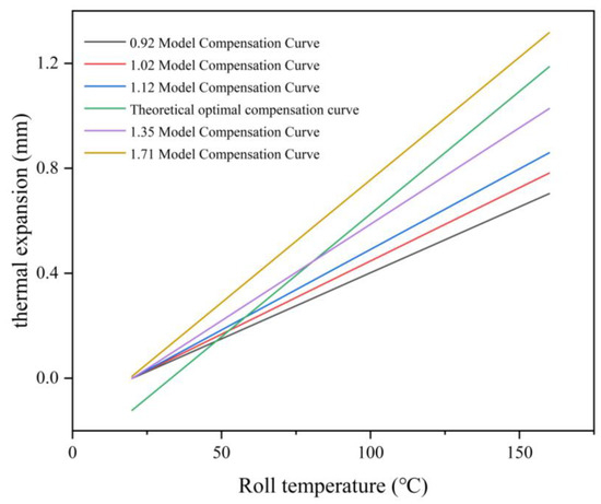 As the thermal expansion compensation coefficient increases, the model compensation curve is constantly close to the theoretical optimal compensation curve. The temperature corresponding to the intersection of the model compensation curve and the theoretical optimal compensation curve gradually increases, and when the roll temperature is the temperature corresponding to the intersection of the two curves, the thermal expansion compensation accuracy of the roll is at its maximum. When the temperature is greater than the intersection temperature, the larger the temperature, the smaller the compensation accuracy. When the temperature is smaller than the intersection temperature, the smaller the temperature, the smaller the compensation accuracy.