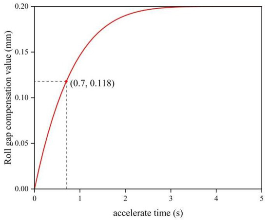 In order to reduce the difference in thickness, when the mill starts to speed up, the roll slit is compensated. The roll slit is lifted up by 0.2 mm during the whole speed-up interval. Where a is the acceleration of the ramp-up section, which is about 23.67 m/(min·s), the low-pressure material ramp-up compensation equation is y = −1.18 × 10−5(x − 5.07)6 + 0.2. The curve is shown in Figure 5.