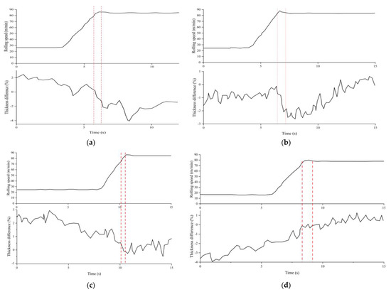 The rolling speed during the final pass is increased from 10 m/min to 130 m/min, and the speed changes dramatically. The process of speeding up the mill after coiling leads to a significant thinning of the strip thickness difference [28]. The distance between the roll gap and the thickness gauge is 2.6 m, while the distance between the beginning of the speed-up point and the beginning of the thinning point is calculated to be about 2.2 m, with a difference of 0.4 m. The distance between the roll gap and the thickness gauge leads to the thickness thinning and lagging behind the mill speed-up. At the same time, taking into account the amount of front slip of the strip, response time, data transmission time, and hydraulic cylinder execution time of the delay, it can be assumed that the thickness thinning occurs as soon as the speed increases.