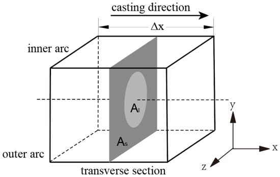 To establish the analysis model, a “Representative Volume Element” (RVE) [2] is employed in this study (as shown in Figure 1) and is considered as the volume at a certain position of the billet in space that is large enough to include multiple microstructure features and small enough that the important variations in the temperature, enthalpy, density, concentration, and volume fraction of the different phases can be assumed to be uniform over the RVE, and is supposed to be constant but may vary with time and distance. In the element volume, solid back diffusion and solidified shell contraction are not considered, and the element volume consists of liquid and solid phases. The mass or species of the RVE is varied through the relative motion of the liquid phase.